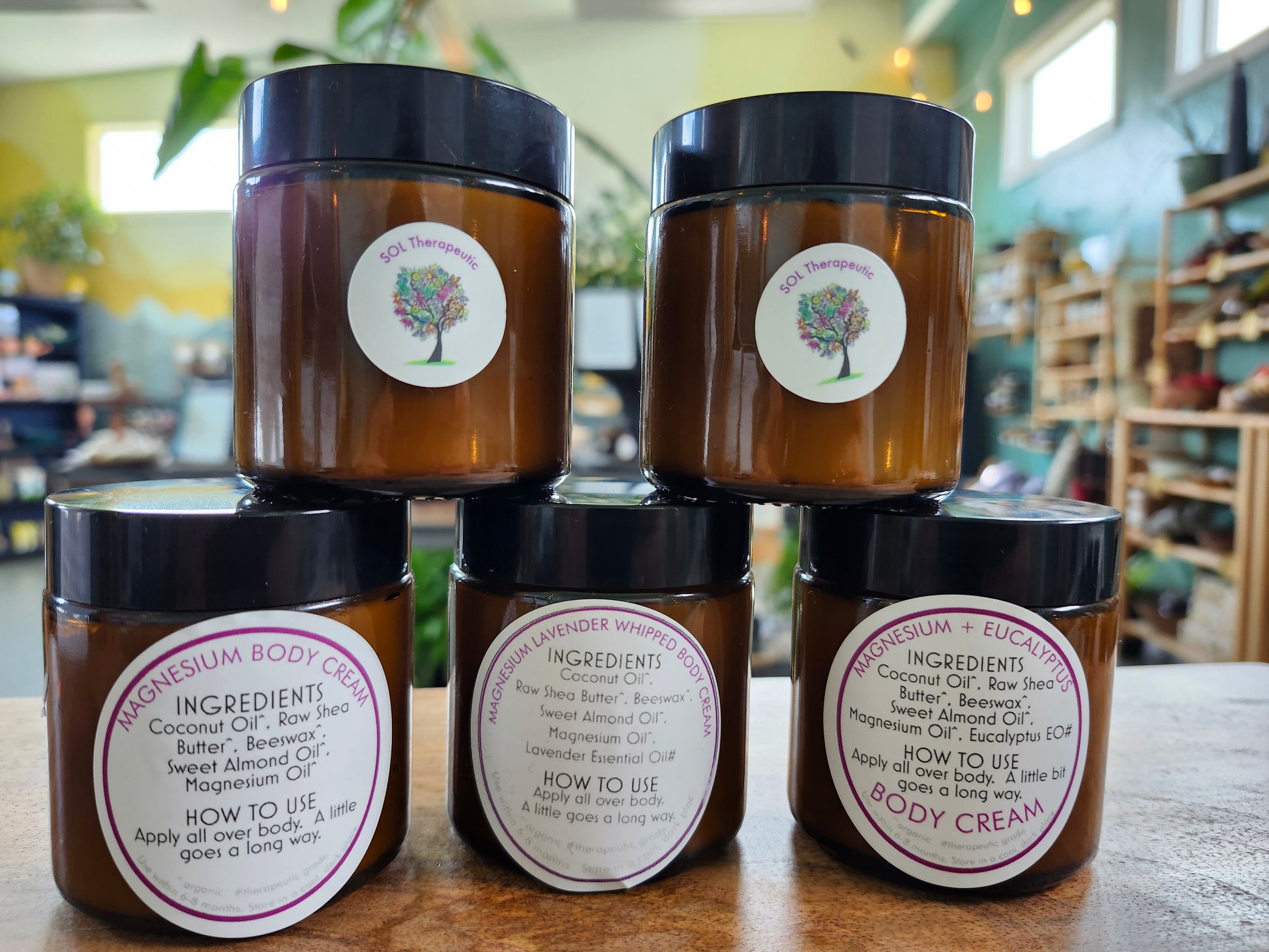 Ingredients: Organic Coconut Oil, Organic Raw Shea Butter, Organic Beeswax, Organic Sweet Almond Oil, Organic Magnesium Oil. In scented varieties: Certified Pure Therapeutic Grade Essential Oils (Eucalyptus or Lavender).